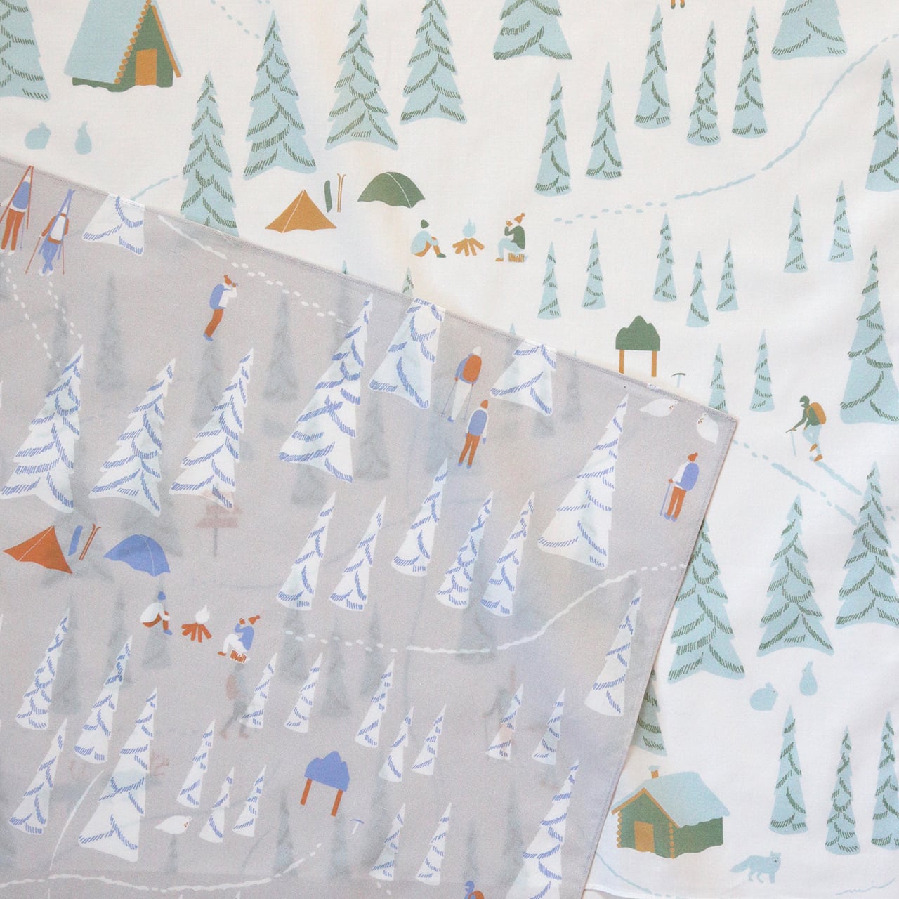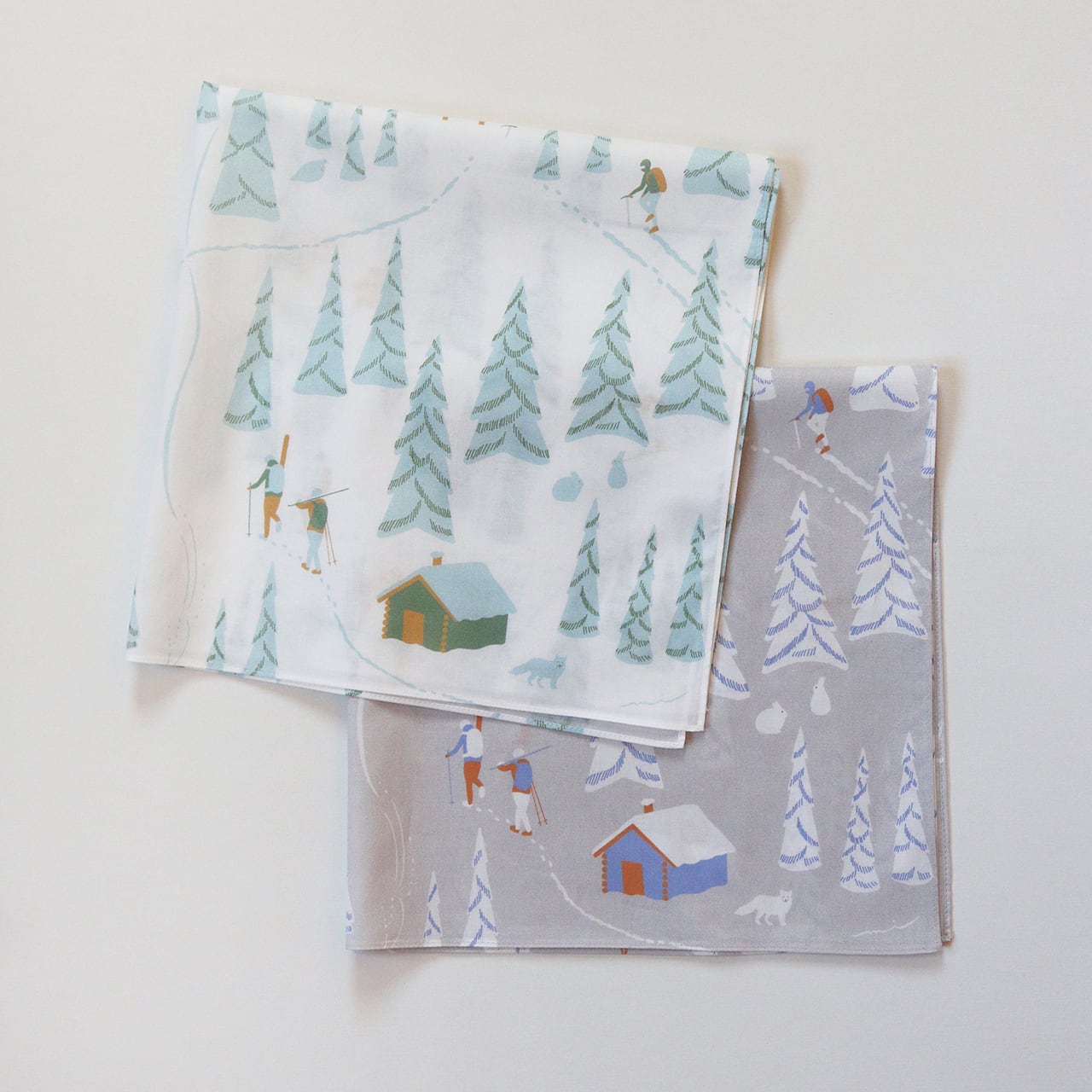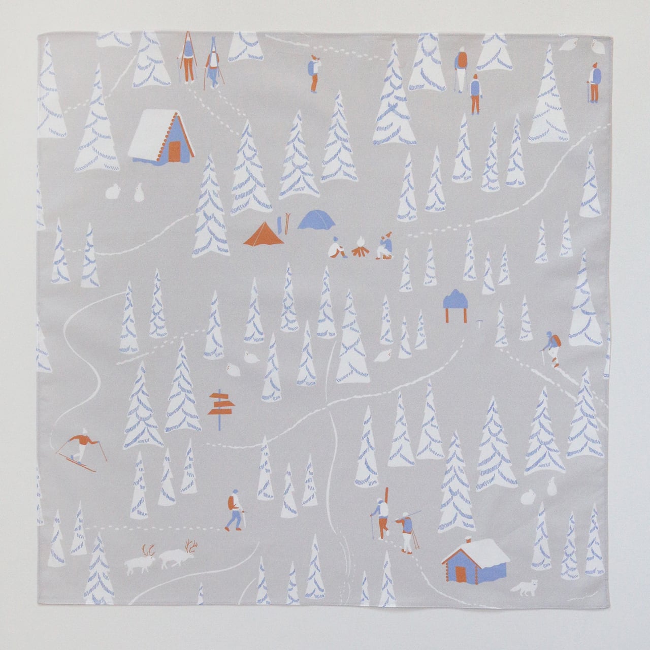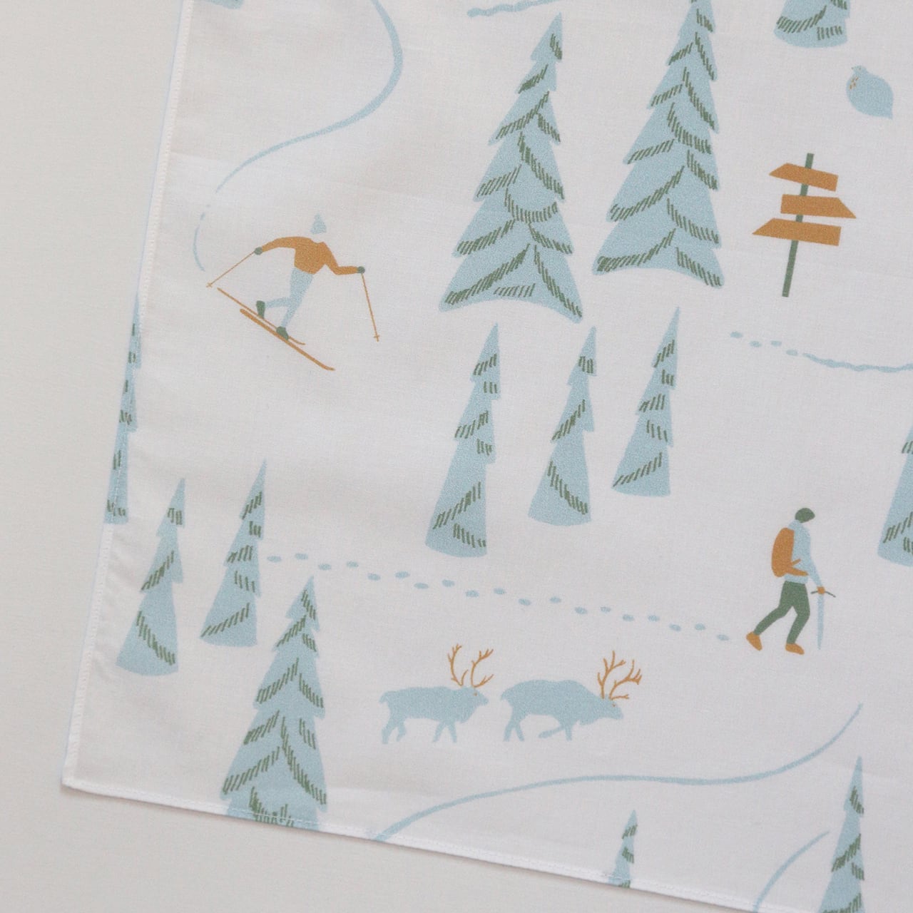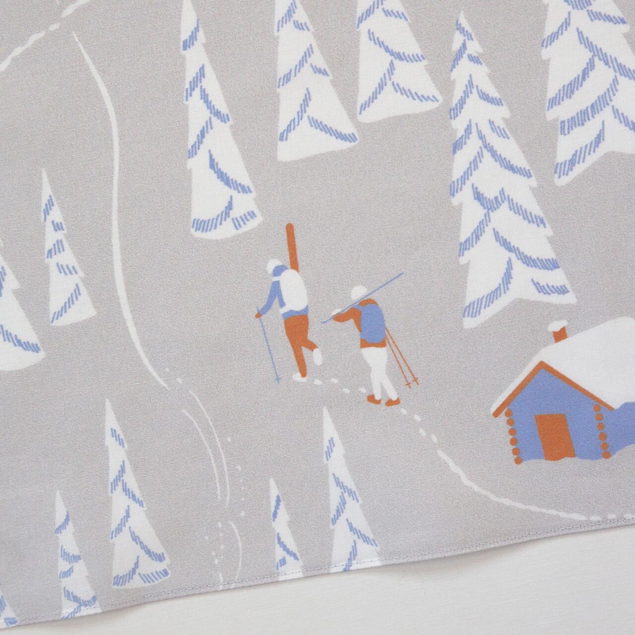 雪山で遊ぶ人々や、動物たちをモチーフに描いた図案です。