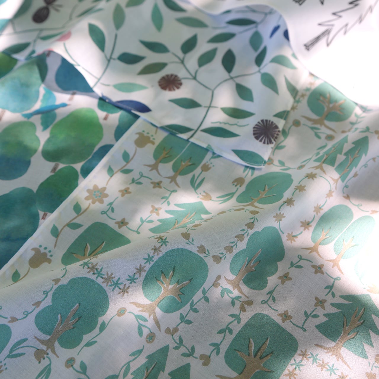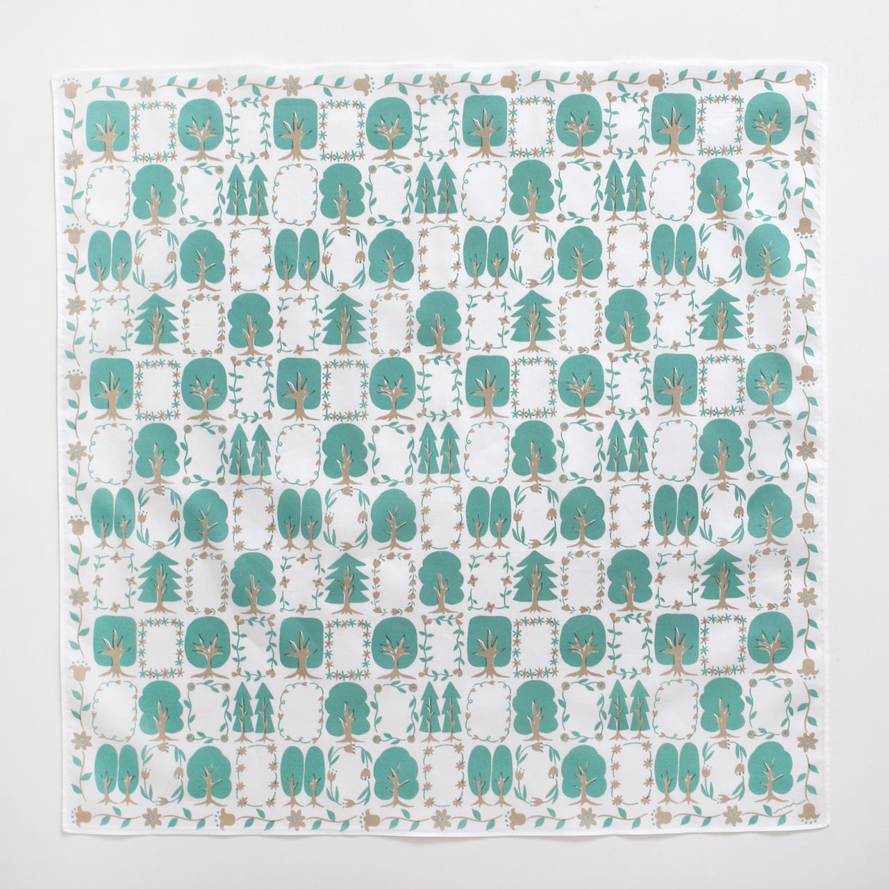木々や草花を規則正しく並べてパッチワークのように描きました。四辺を囲っている柄が、首や頭に巻いた時にアクセントになります。